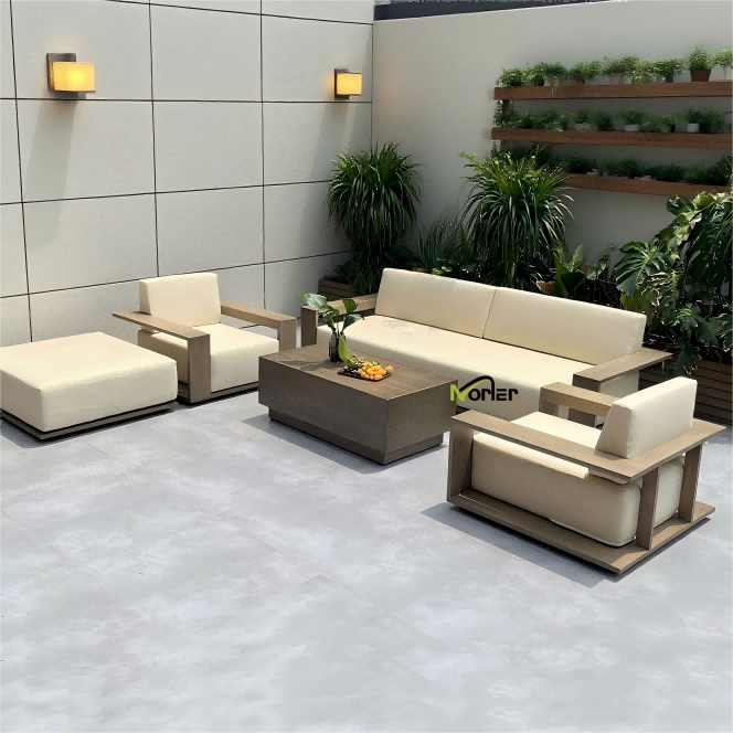 5. Sofá de teca para exteriores: fabricado con teca natural altamente resistente a la intemperie, este sofá cuenta con una veta fina, alta estabilidad y desarrolla una sensación más lujosa con el uso, lo que lo convierte en una opción clásica para crear un balcón estilo centro turístico de alta gama.