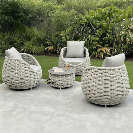 4.Sofá de exterior con cuerda: el diseño de cuerda trenzada a mano es visualmente ligero y transpirable, y el marco de aluminio añade un toque moderno. Combinando comodidad y arte, es una opción popular para crear un balcón sofisticado.