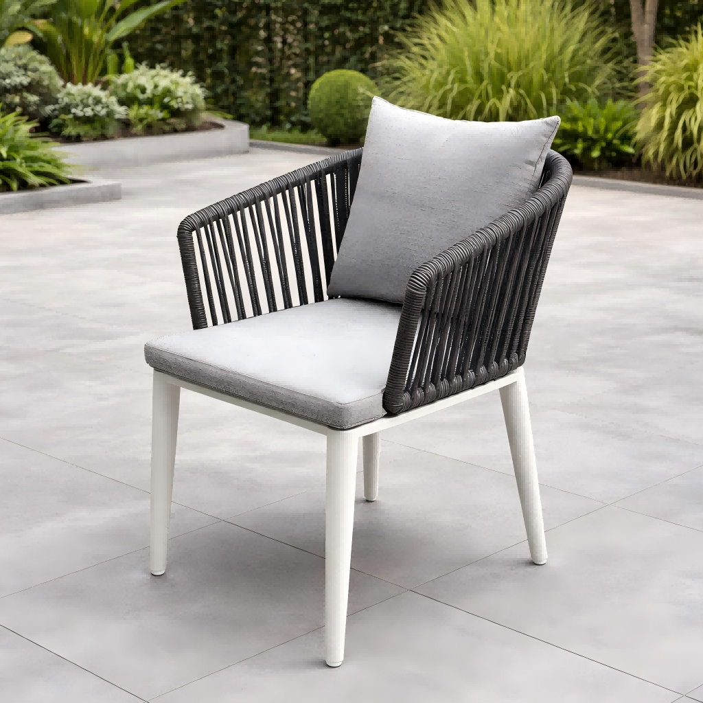 Las sillas de comedor cuentan con un respaldo tejido de cuerda, lo que crea una apariencia moderna y elegante al mismo tiempo que brinda un apoyo cómodo. El marco está hecho de aluminio con recubrimiento en polvo, que ofrece una excelente resistencia al óxido y a las condiciones climáticas exteriores.